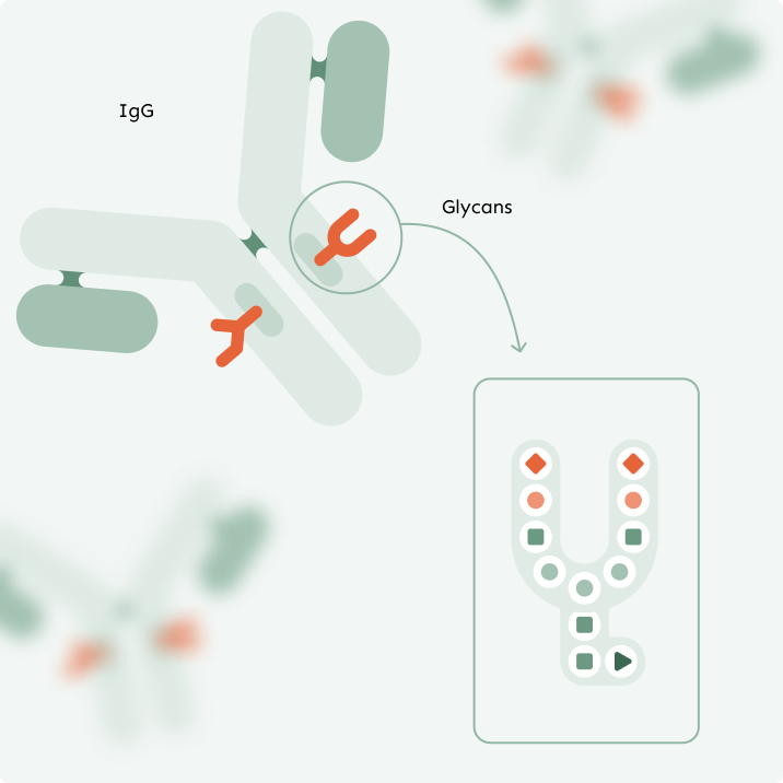 At GlycanAge, we study a specific group of glycans on Immunoglobulin G (IgG), the main protective antibody. These glycans act like switches, turning immune activity up or down, and are closely linked to inflammation and long-term health.